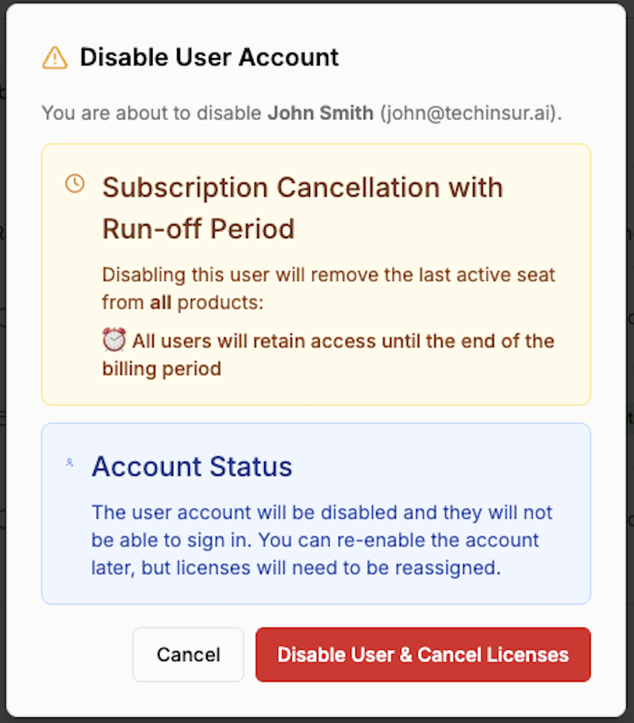 Disabling a user immediately prevents them from signing in and may affect product licenses and subscription billing.