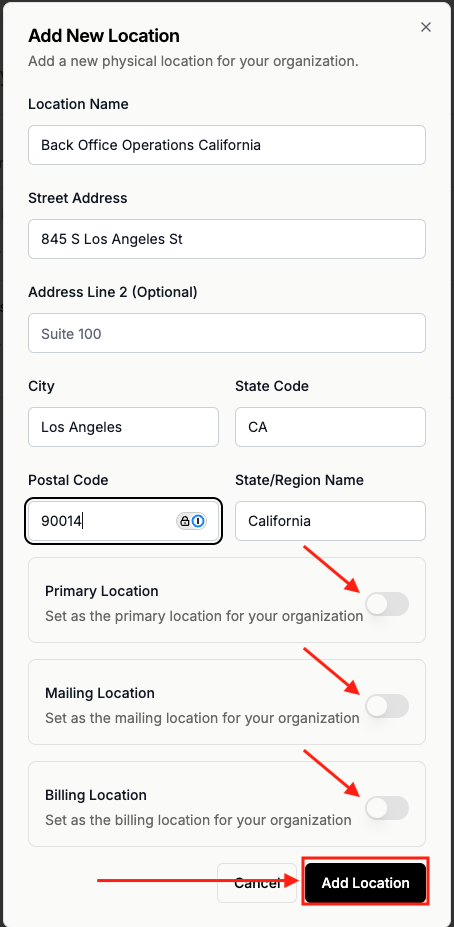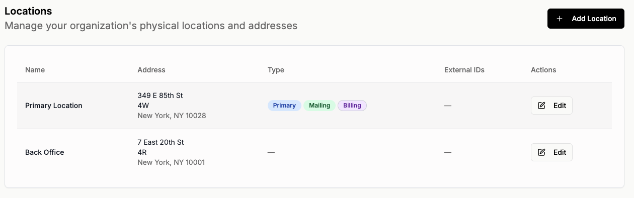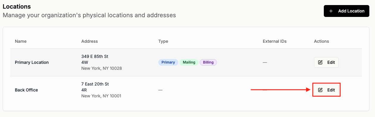 Account Owners and Billing Managers can manage your organization’s physical locations from the Locations tab in Settings.