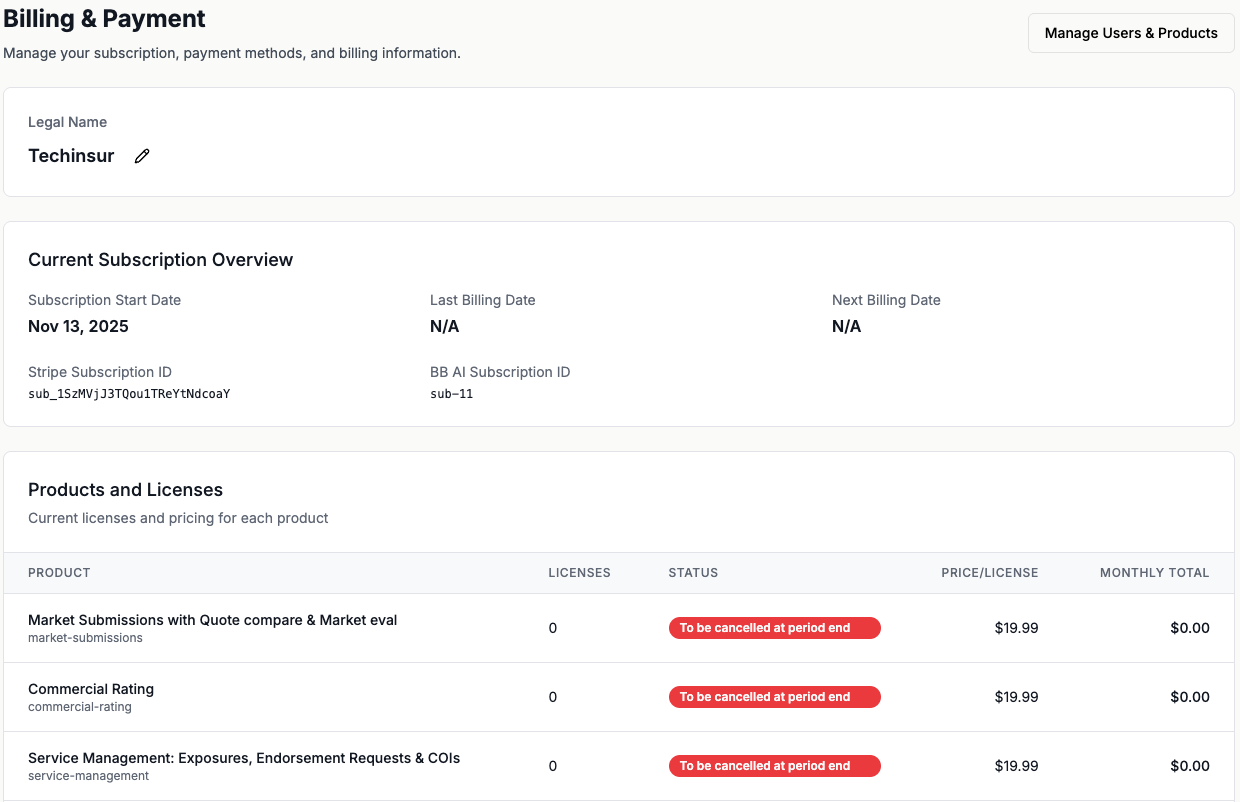 Account Owners and Billing Managers can manage subscriptions, licenses, and payment methods from the Billing & Payment tab in Settings.